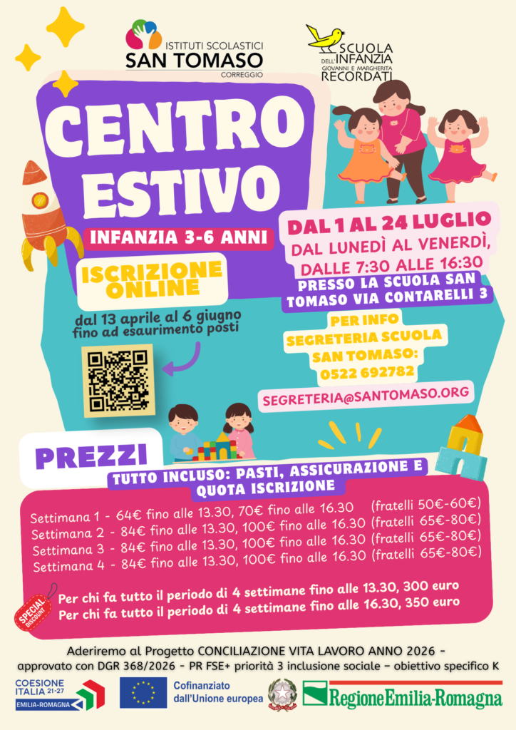 Siamo lieti di annunciare l’apertura delle iscrizioni per il Centro Estivo 2026 degli Istituti Scolastici San Tomaso di Correggio. Un’occasione per offrire ai bambini un’estate all’insegna del divertimento, della socializzazione e del gioco in un ambiente sicuro e stimolante.